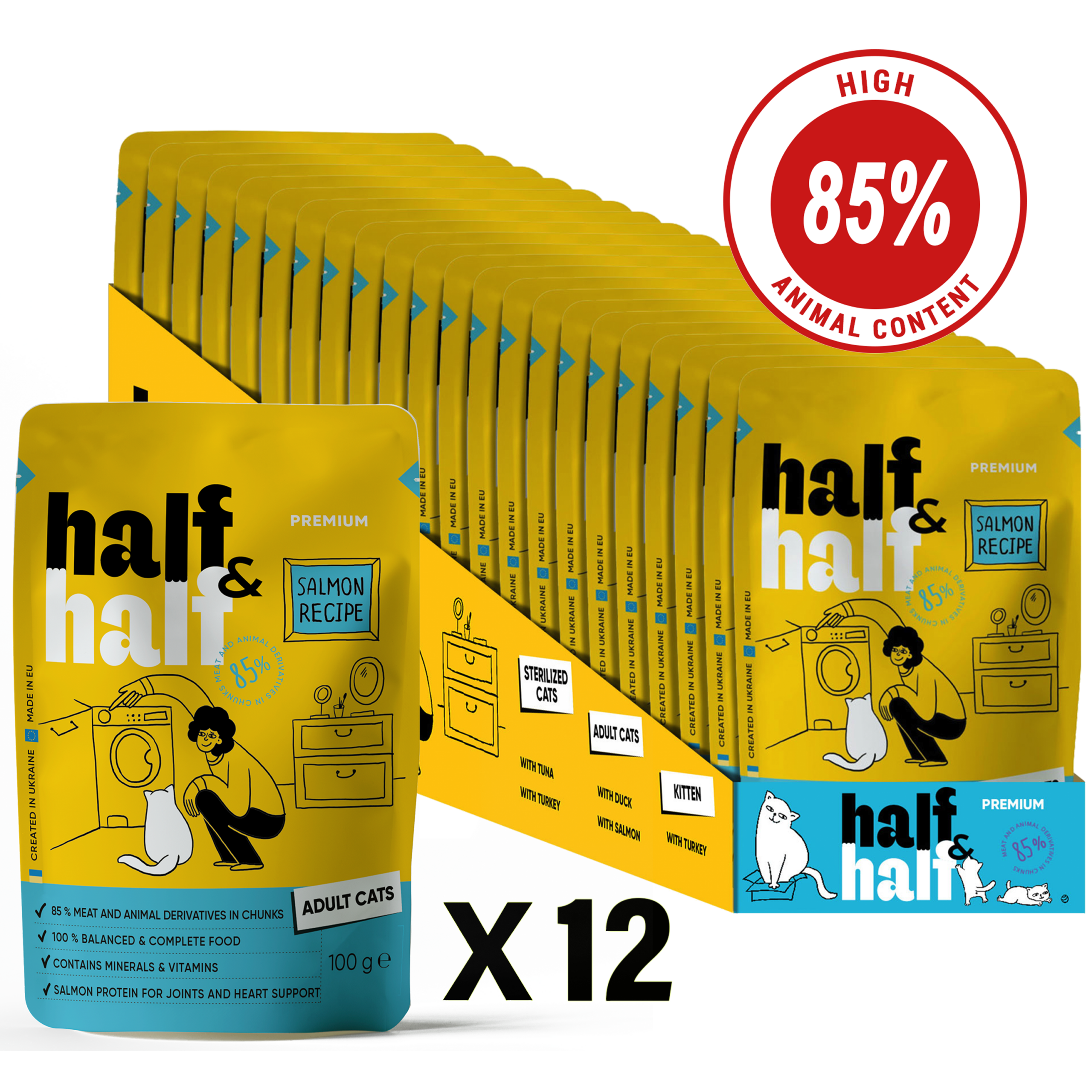 Half&Half Adult Cat Wet Food with Salmon in Jelly – 100g x12 – Salmon Recipe, Complete Nutrition & Hydration Support