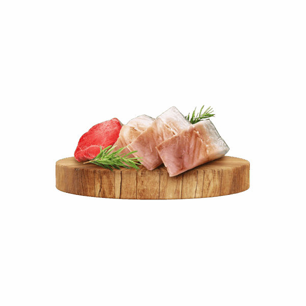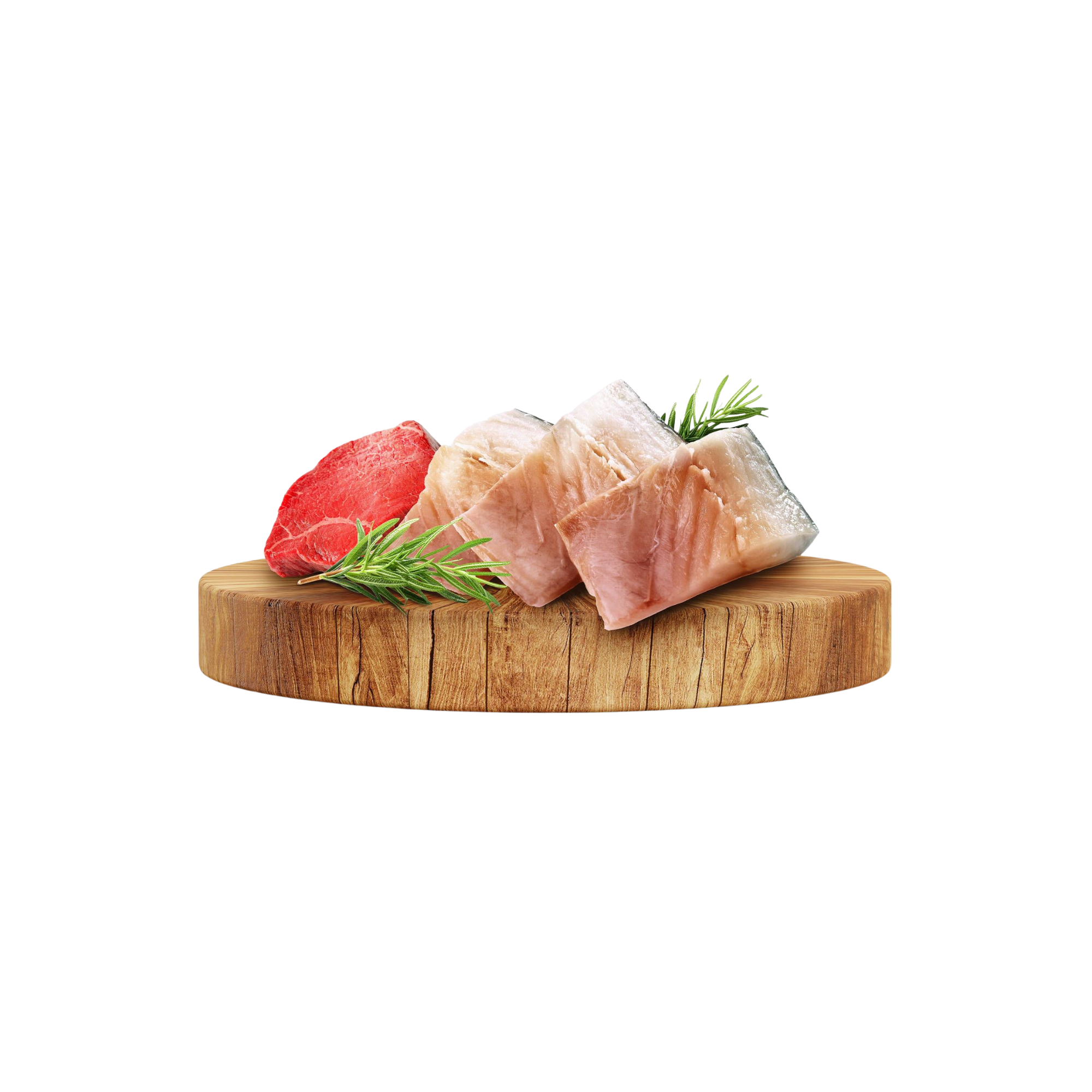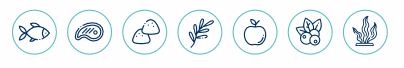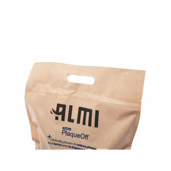 Composition: meat (fresh fish meat 21.6%, dehydrated beef 15%, fresh beef 11.2%, dehydrated fish meat 4%), rice, peas, poultry fat, dried apple pulp, beet fibre, hydrolysed fish protein 3%, yeast, salmon oil, minerals, Ascophyllum Nodosum (Kelp) PlaqueOff 0.1%, cranberry, glucosamine, chondroitin sulphate, Yucca schidigera.