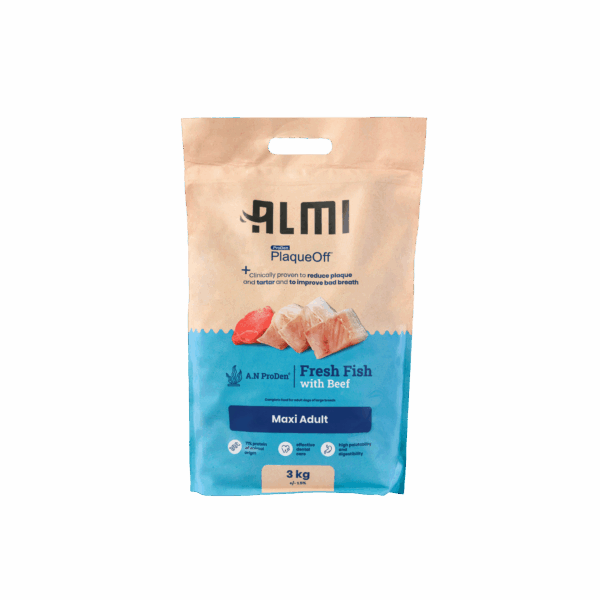 The fine-tuned formula with 71% animal protein ensures balanced nutrition. ALMI Maxi Adult dry dog food contains fresh fish and beef, peas, apples, and beet fibre. There are zero artificial colourants. We preserve the feed naturally with rosemary extract. The addition of rice helps with easy digestion.