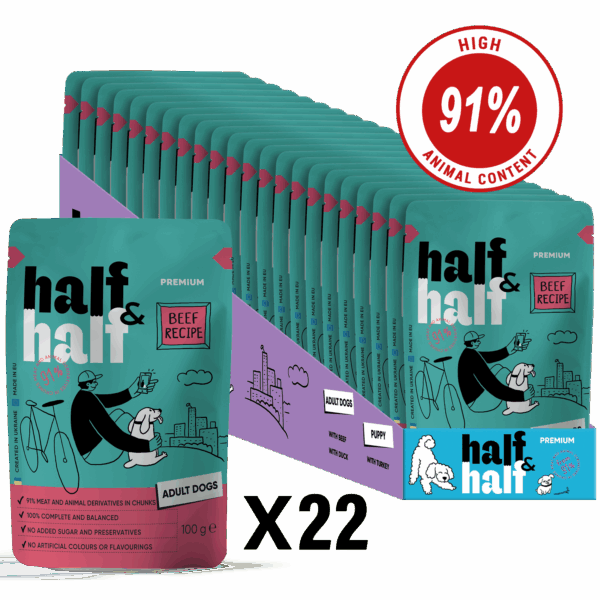Half&Half Adult Dog Wet Food with Beef in Sauce is a premium class complete wet food for adult dogs, formulated to support everyday nutrition, hydration, and digestive comfort. This highly palatable recipe features tender meat pieces with beef in sauce, making it ideal for daily feeding either as a complete wet diet or as part of a mixed feeding routine with dry food.