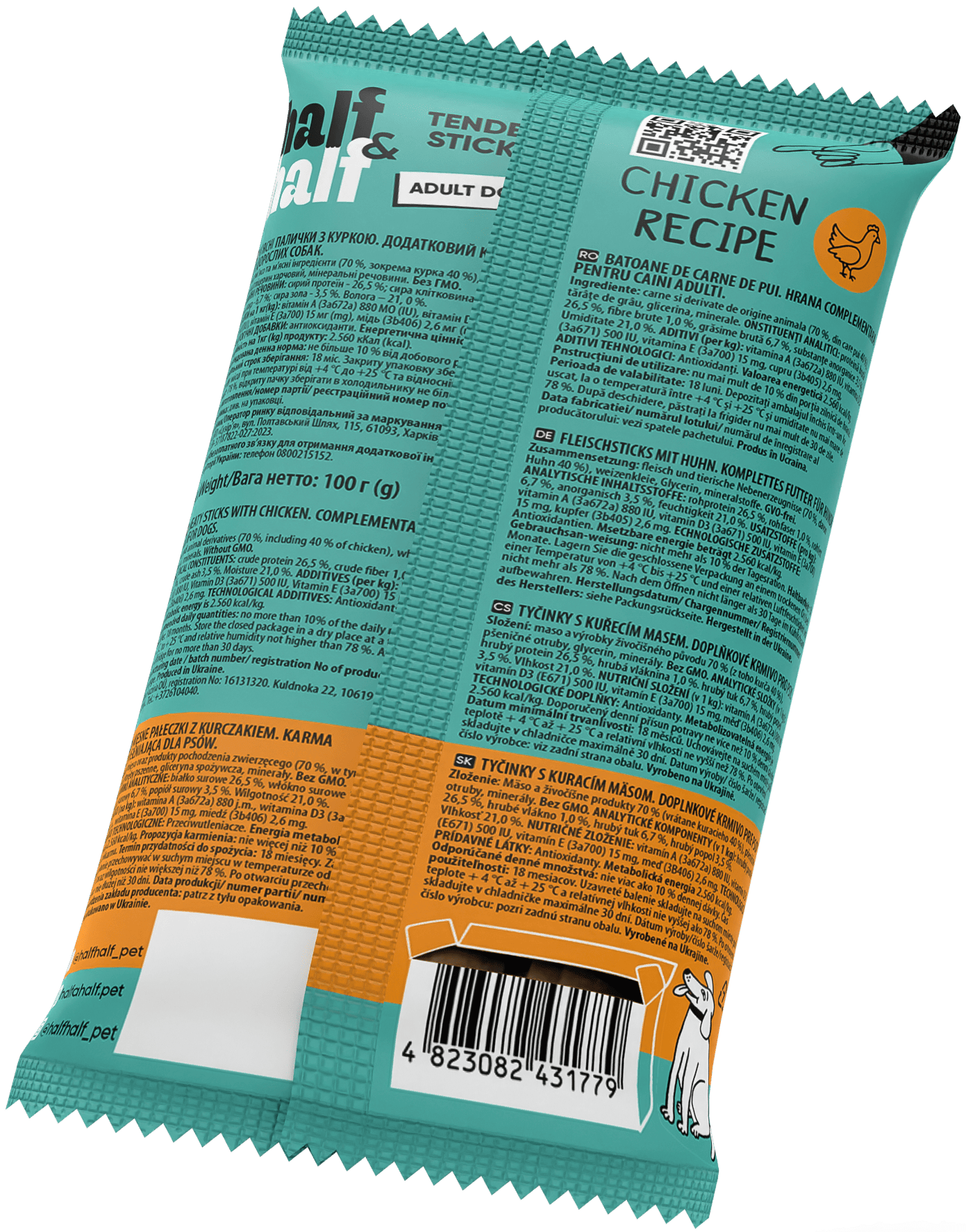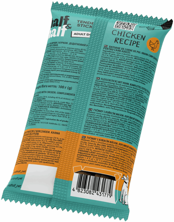 Half&Half Meat Sticks for Dogs with Chicken are a complementary food for dogs, ideal for training, rewarding, and reinforcing positive behaviour. Thanks to their soft and juicy texture, these meat sticks can be easily broken into smaller pieces for miniature breeds or given whole to larger dogs, making them suitable for dogs of all sizes.