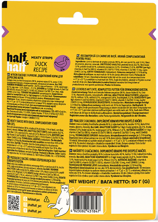 Half&Half Meat Treats for Adult Cats with Duck are a complementary food for cats, designed as a tasty and nutritious reward to complement the daily diet. These treats are made from natural meat ingredients and formed into small, soft pieces that are easy and convenient for cats to eat.