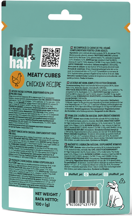 Half&Half Meat Treats for Adult Dogs with Chicken are a complementary food for dogs, created as a natural and tasty reward to supplement the daily diet. Formed into soft, easy-to-chew pieces, these treats are especially suitable for small and miniature breeds, while still being enjoyable for dogs of all sizes.