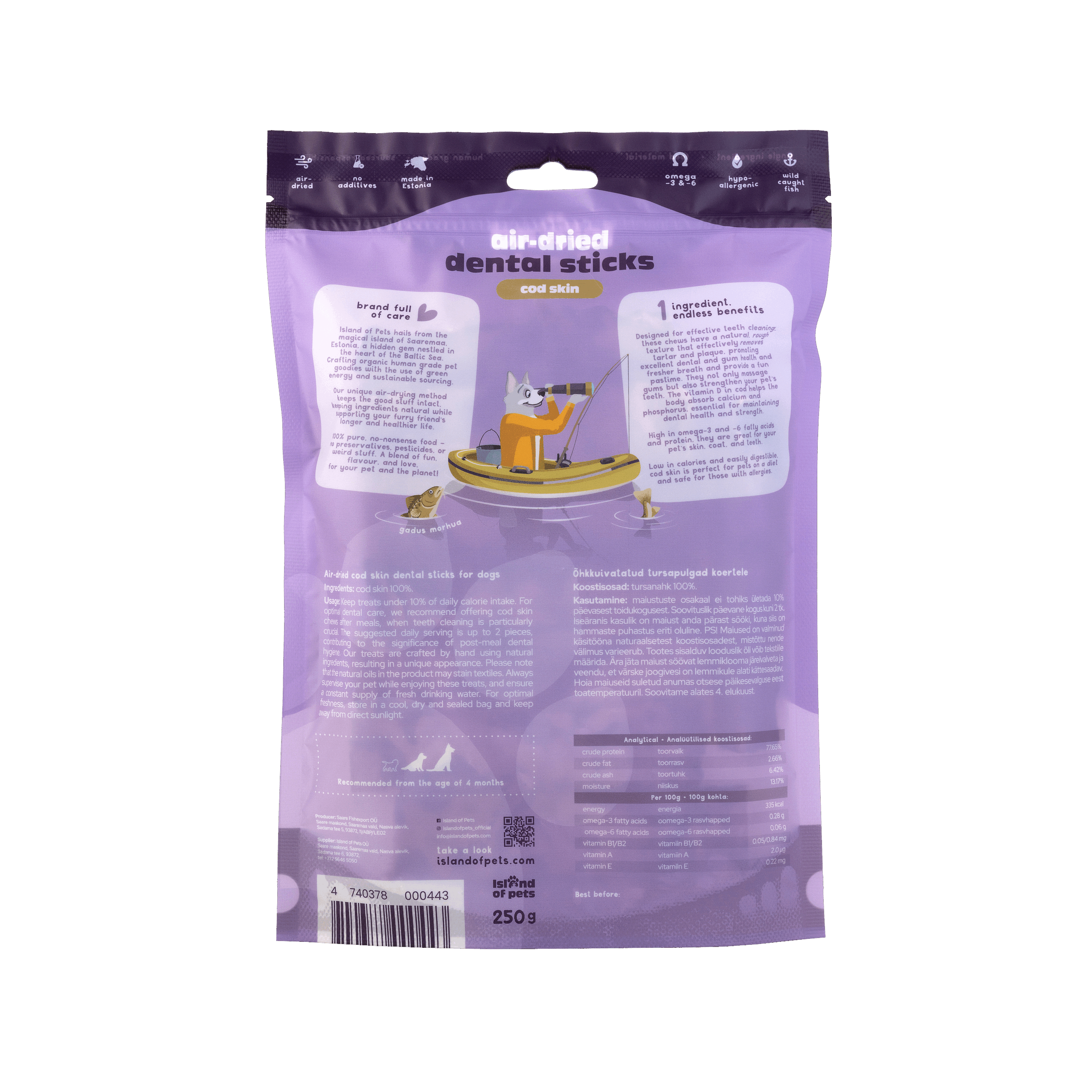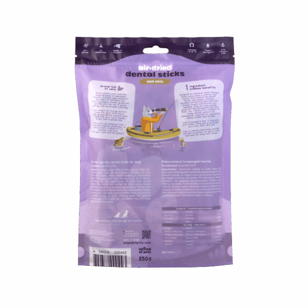 Designed for effective teeth cleaning, these chews have a natural, rough texture that effectively removes tartar and plaque, promoting excellent dental and gum health and fresher breath and provide a fun pastime. They not only massage gums but also strengthen your pet’s teeth. The vitamin D in cod helps the body absorb calcium and phosphorus, essential for maintaining dental health and strength. High in omega-3 and -6 fatty acids and protein, they are great for your pet’s skin, coat, and teeth. Low in calories and easily digestible, cod skin is perfect for pets on a diet and safe for those with allergies.