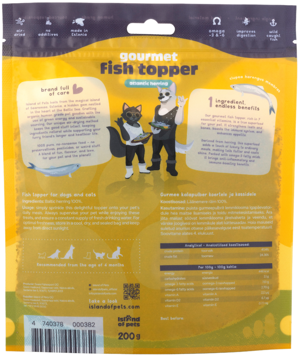 Elevate your pet’s daily meals with a gourmet superfood topper made from 100% herring, naturally rich in omega-3 fatty acids, essential vitamins, and high-quality protein. This nutrient-dense topper enhances appetite, strengthens bones and teeth, supports immune health, and adds irresistible aroma and flavor to any meal — perfect for both cats and dogs, especially fussy eaters or pets recovering from illness.
