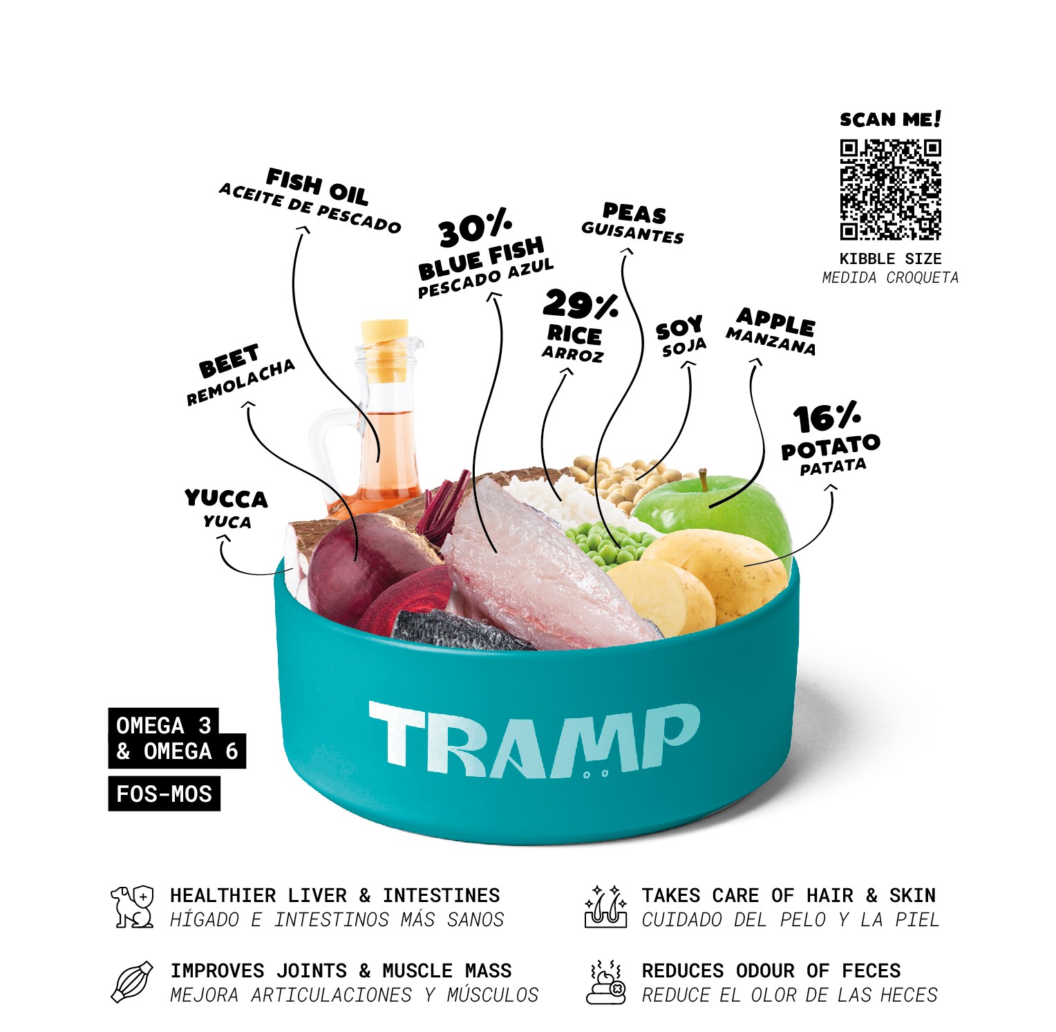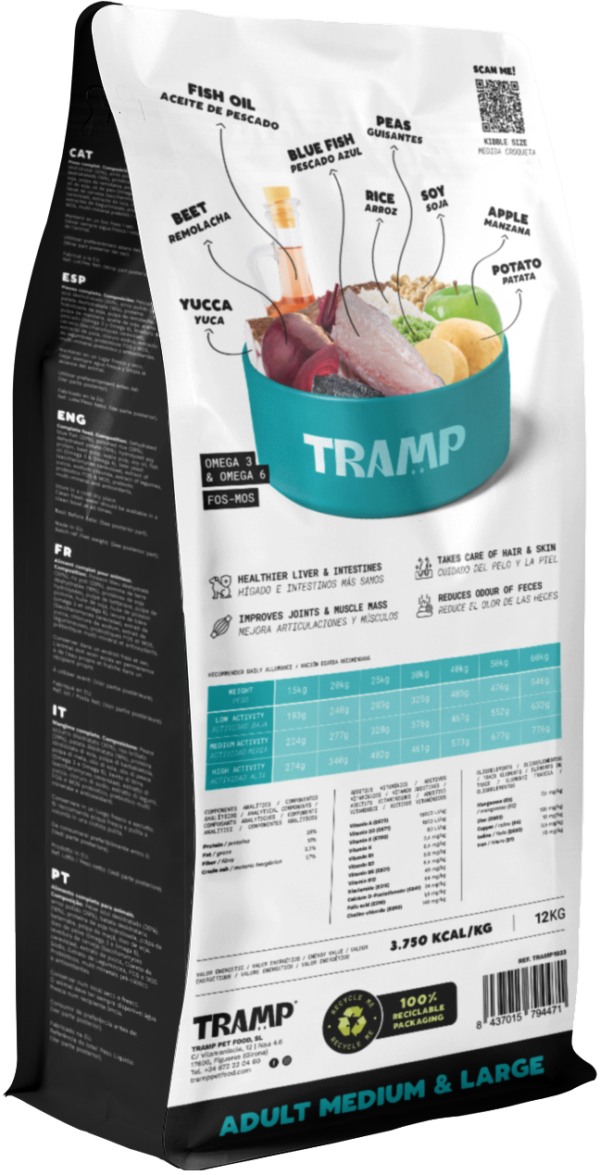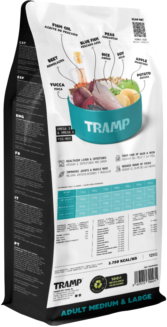Dehydrated blue fish (30%), Polished rice (29%), Dehydrated potato (16%), Hydrolyzed soy protein, Beet pulp, Apple pulp, Soy oil, Fish oil (Omega-3 & Omega-6), Beer yeast (Saccharomyces cerevisiae), Yucca extract, Sodium chloride, Extract of legumes, Probiotics (FOS & MOS), Prebiotic multi-mineral, Antioxidants.