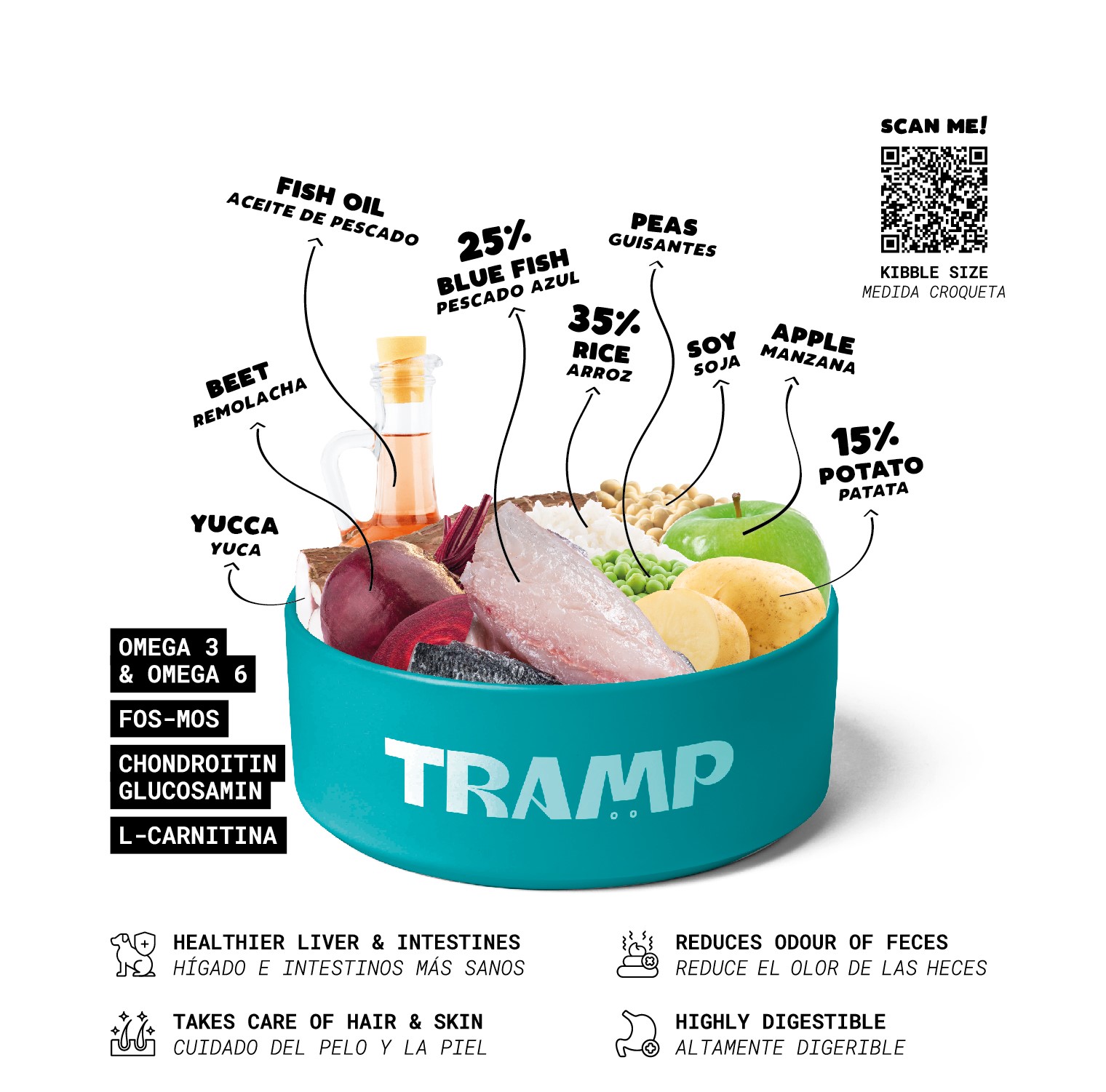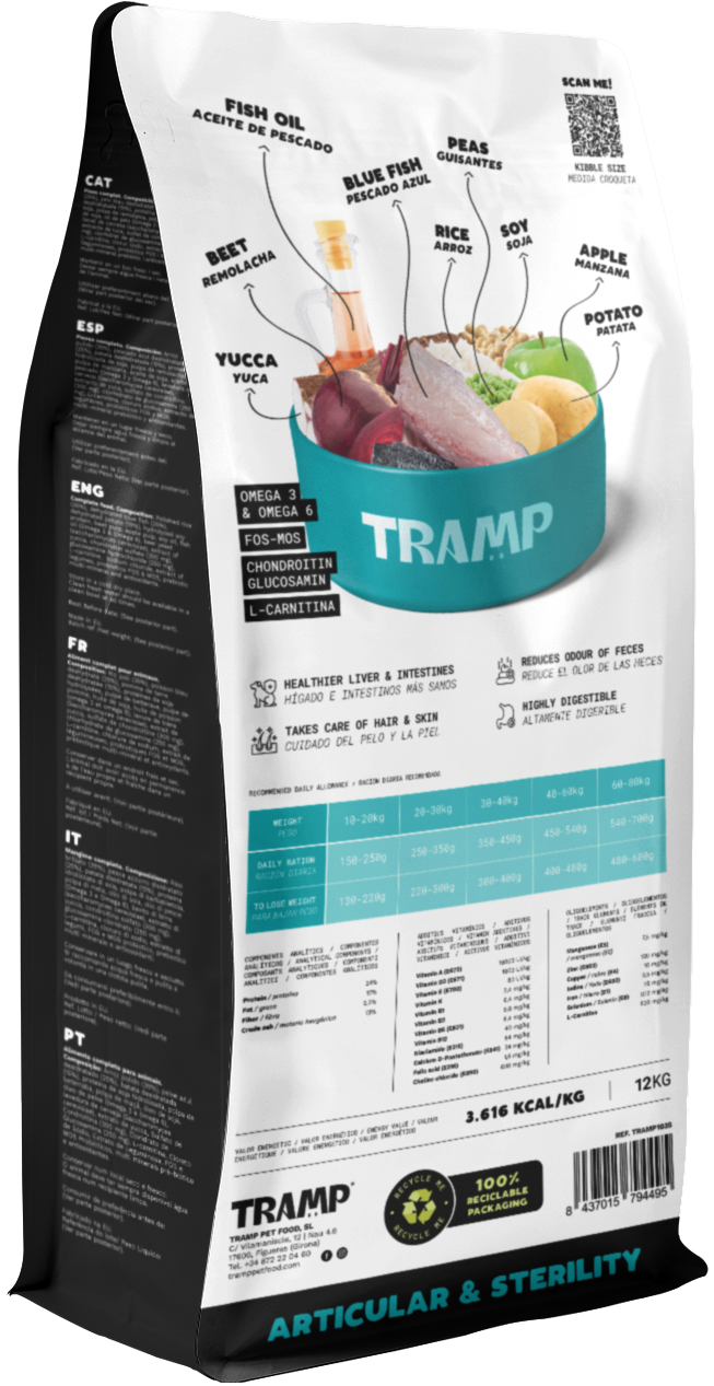 Polished rice (35%), Dehydrated blue fish (25%), Dehydrated potato (15%), Hydrolyzed soy protein, Beet pulp, Apple pulp, Soy oil, Fish oil (Omega-3 & Omega-6), Beer yeast (Saccharomyces cerevisiae), Yucca extract, Chondroitin sulfate (300 mg), Glucosamine hydrochloride (250 mg), L-Carnitine, Sodium chloride, Extract of legumes, Probiotics (FOS & MOS), Prebiotic multi-mineral, Antioxidants.