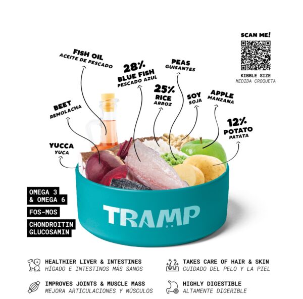 Dehydrated blue fish (28%), Polished rice (25%), Dehydrated potato (12%), Hydrolyzed soy protein, Beet pulp, Apple pulp, Soy oil, Fish oil (Omega-3 & Omega-6), Beer yeast (Saccharomyces cerevisiae), Yucca extract, Chondroitin sulfate (300 mg), Glucosamine hydrochloride (250 mg), Sodium chloride, Extract of legumes, Probiotics (FOS & MOS), Prebiotic multi-mineral, Antioxidants.