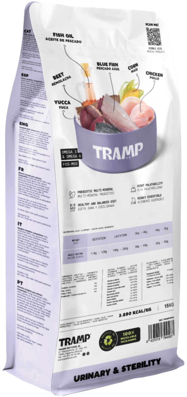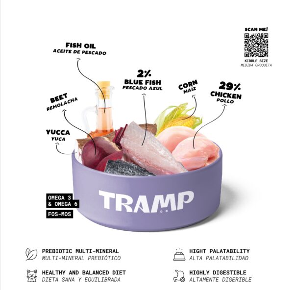 Dehydrated chicken (29%), Corn, Chicken fat, Gluten meal, Dehydrated fish, Extruded corn flour, Beer yeast (Saccharomyces cerevisiae), Fish oil (Omega-3 & Omega-6), Gluten feed, Chicken hydrolysate, Beet pulp, Sodium chloride, Probiotics (FOS & MOS), Yucca extract, Prebiotic, Multi-minerals, Antioxidants.